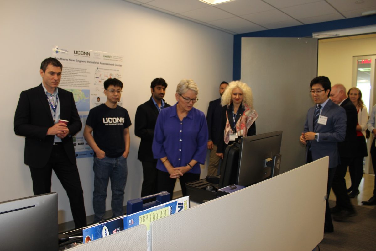 “Secretary Granholm’s visit to the SNE-IAC, and her press release announcement about expanding the IAC program and funding, shows her and the DoE’s strong support for the IAC program nationwide,” says Dr. Amy Thompson, UConn SNE-IAC Assistant Director and the Associate Director for the Institute for Advanced Systems Engineering. “The SNE-IAC students were excited to meet Secretary Granholm and prepared their instrumentation and software to demonstrate some of the tools and methods the students will use to assess industrial facilities in Connecticut. The SNE-IAC program is key to developing an energy engineering and manufacturing workforce in Connecticut. The engineering students get a great opportunity through the SNE-IAC program to build on the engineering theory they learn in their engineering courses and apply their knowledge in the field at industrial sites. There is nothing like the experience of learning first-hand in an industrial facility how to use instrumentation and sensors to collect data for recommending energy efficiency and operational improvements. The students get a chance to work with real full-scale equipment in the field, which promotes hands-on experiential learning. The students who participate in the SNE-IAC program are expected to develop a stronger technical and professional skill set, which means we are better preparing our UConn engineering graduates for their first jobs. The knowledge, methods, and examples that SNE-IAC Directors create through developing and running the program at UConn will be disseminated into new courses and content to share the energy assessment methods and techniques with the broader engineering student community at UConn. We also appreciate the support from the ENERGIZE CT programs and the Conservation and Load Management programs at Eversource and United Illuminating in helping us develop best assessment practices that will result in the highest levels of rebates and incentives for companies participating in the UConn SNE-IAC program.”